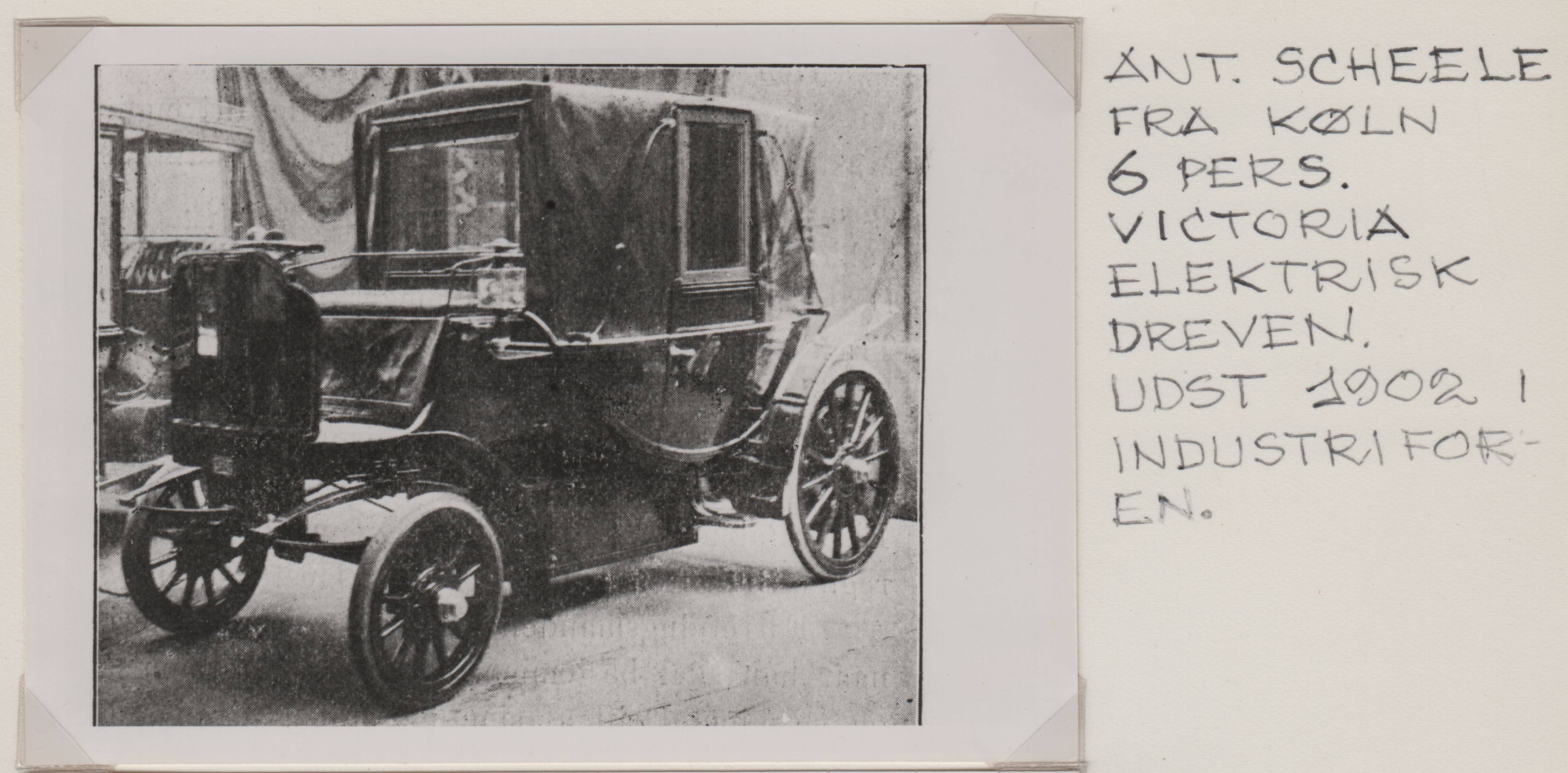 | Beskrivelse: | Antagelig Scheele fra Köln, 6 personers Victoria, elektrisk drevet, udstillet 1902 i Industriforeningen |