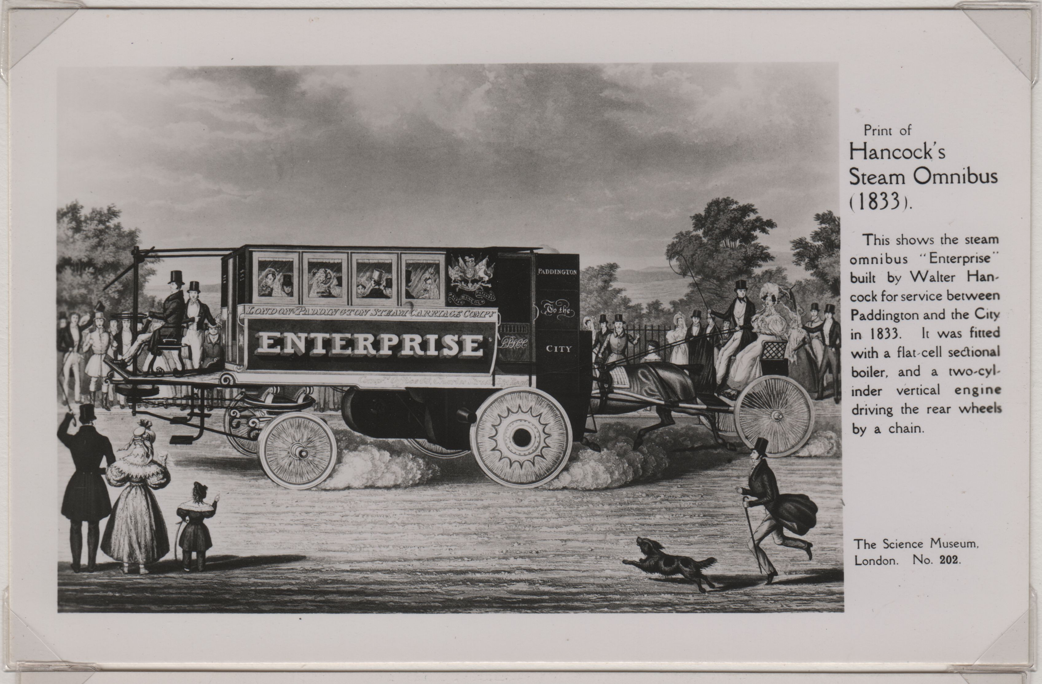 | Beskrivelse: | Gurney's Steam Coach (1827), Hancock's Steam Omnibus (1933), hestetrukne spovogne ved Marble Arch (1861), Motorvogne ved Ludgate Circus, Motor Omnibus "B" (1910) |
